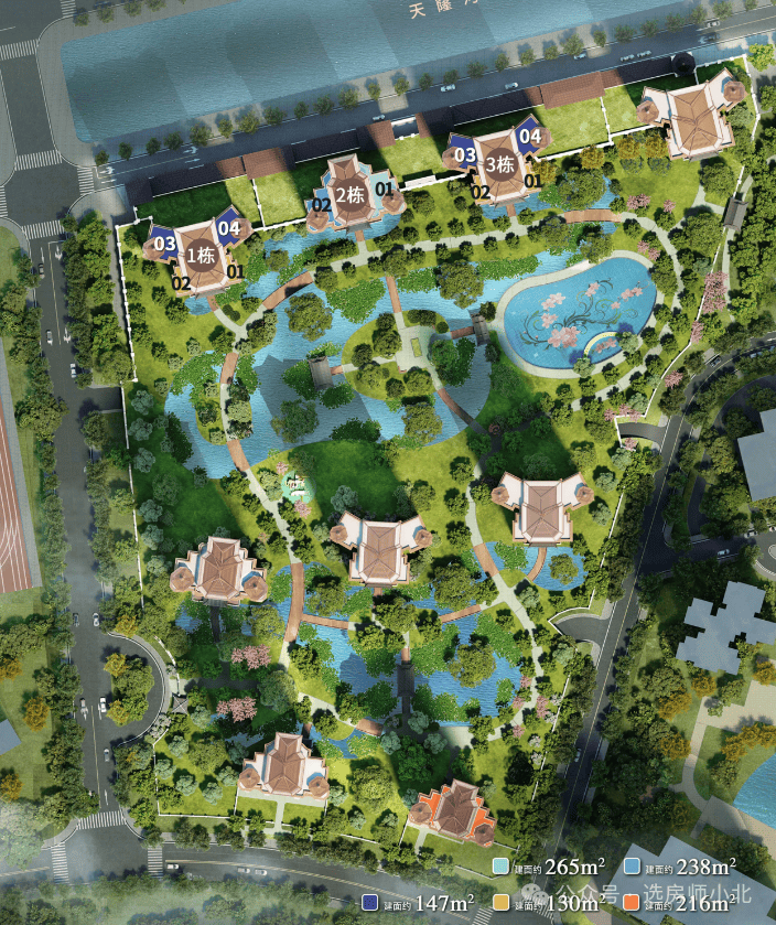目前项目主要在售R40-1.2.3栋和R5-5栋,户型为130-147-216-238-265平的三至五房,单价2.5万起!面积越大越贵,有毛坯有装修,户型图如下: