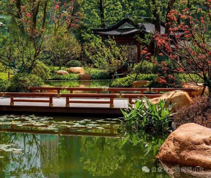 星河湾的水系园林中,每一棵植物,都考虑到了它们10年以后的生长,走进星河湾的园林,中式建筑、亭台水榭、蜿蜒水系.......每一帧都美得像画卷