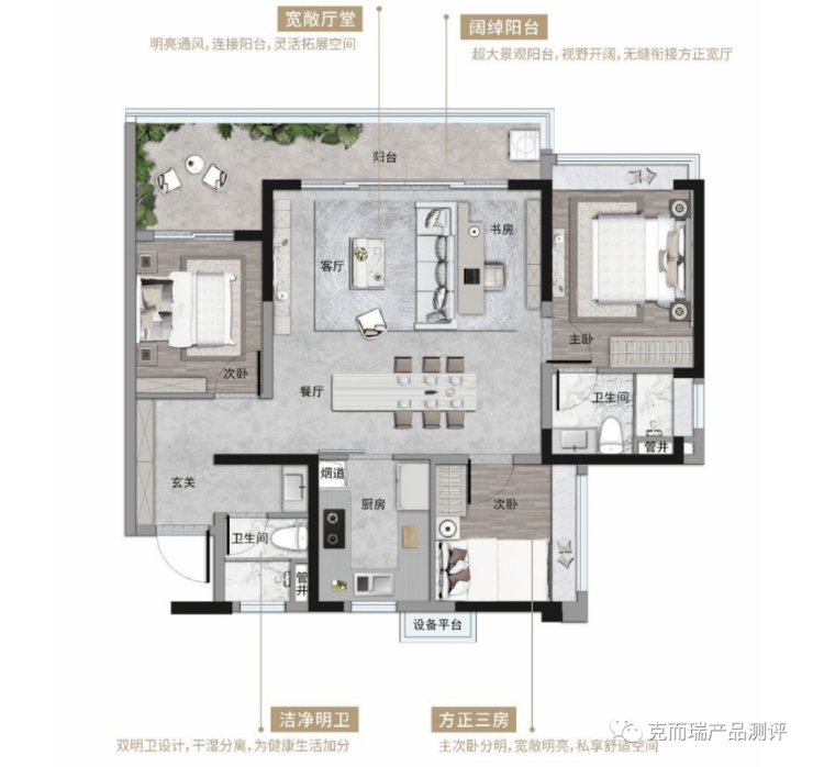 建面约110㎡3房户型,超大L型景观阳台就是点睛之笔,意味着视野也是270°环幕的,同时实现巨幕采光。