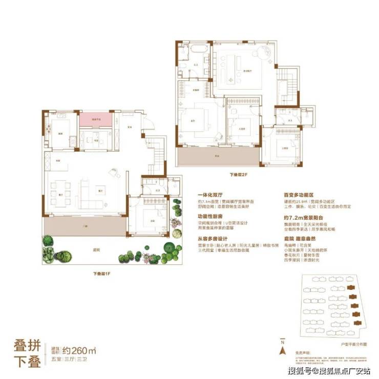 这个建筑面积约260㎡的下叠户型,做到了5房3厅3卫!一楼带私家庭院,约7.2米面宽的大横厅直连南向阳台,另外下层公共区域布置餐客厅、书房和次卧,方便家中老人起居。