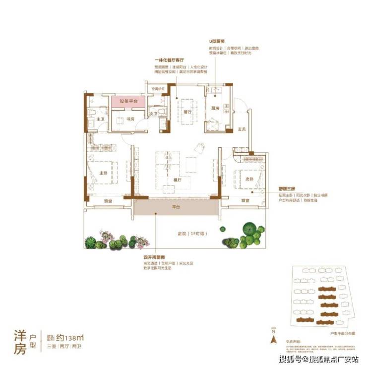 建筑面积约138㎡洋房户型,横厅设计,南北通透,南向主次卧均带有大飘窗,进一步增加了使用空间,大面积的阳台极大开拓了室外景观的视野。