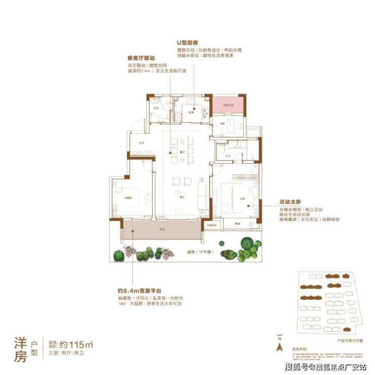 建筑面积约115㎡洋房户型,3开间双卧朝南,在建筑面积约95㎡户型的基础上多出了一个房间的同时,空间进一步得到优化!