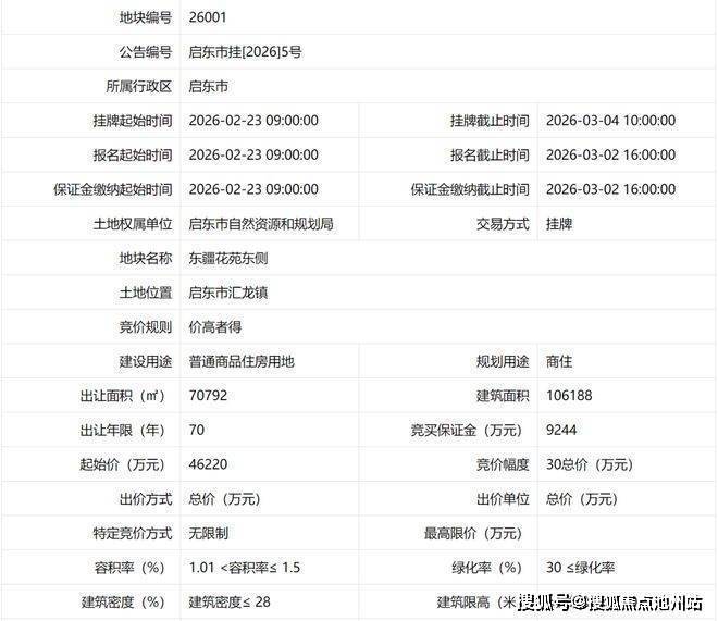 刚刚,启东蝶湖板块挂牌26001地块,起拍楼面价约4353元/㎡,地块位于东疆花苑东侧,出让面积70792㎡,容积率1.01-1.5,限高80米。将于3月4日10时正式出让。