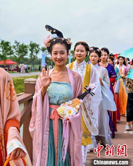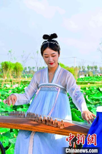 游客身穿传统服饰在肥西丰乐荷花基地游玩。 肥西县委宣传部供图