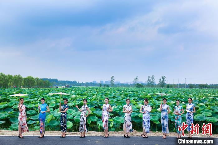 游客身穿旗袍在丰乐荷花基地拍照留念。 肥西县委宣传部供图