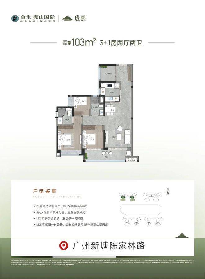 合生湖山国际坐落于增城区新塘镇核心区域的陈家林路,地理位置得天独厚,北面毗邻生态优良的陈家林自然保护区,东侧紧邻凤凰城,西临主干道陈家林路,南接荔枝文化村。项目占地面积约44万平方米,总建筑面积约140万平方米,规划总户数达1万户,其中珑熙板块单独占地约3.8万平方米,建面约17万平方米,户型涵盖三至五房,车位比达到1:1.22,满足社区高品质生活的停车需求。小区整体绿化率达34%,营造自然舒适的居住环境,为业主营造健康宜居的生活氛围。物业管理由康景物业负责,服务水平专业可靠,物业费为2.8元/平方米,为业主提供细致周到的社区服务。