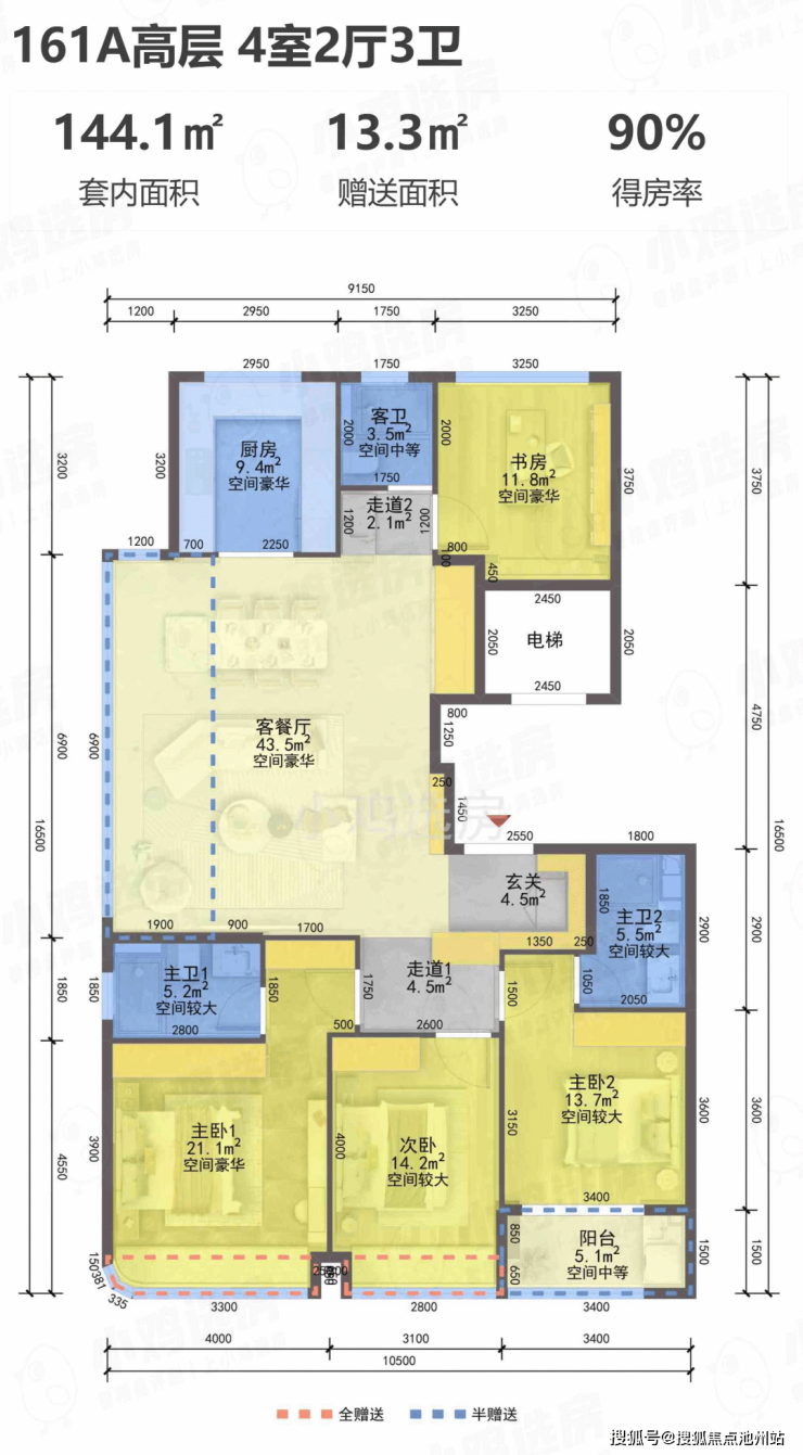 以161方为例,户型套内使用率高达90%,按照以往经验,小高层住宅的得房率一般在80-84%,而现在足足多了6个百分点,161方就是多9.6m²,关键还没有算上入户前厅,因为项目设置均为2T2,实际使用空间较大。