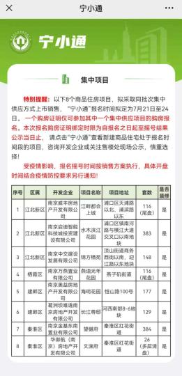 自2021年7月19日起,南京所有新建商品住房项目须通过“宁小通”在线平台报名。持有人才、无住房、普通购房证明的申购人,同样统一在“宁小通”平台报名。