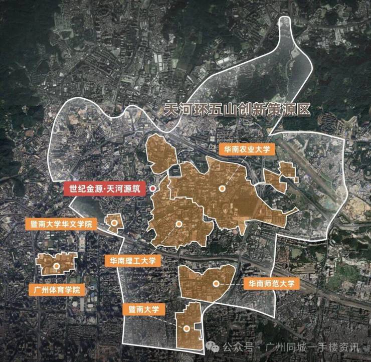 环五山片区是广州百年人文高地,世纪金源·天河源筑紧邻华南理工大学,周边更环绕着华南农业大学、暨南大学、华南师范大学等重点高校。