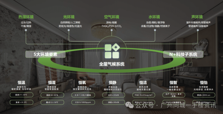 天河源筑的七恒系统,能通过综合调控,实现恒温、恒湿、恒氧、恒静、恒洁、恒智、恒怡的健康生活,一一对应,重点解决三大难题。