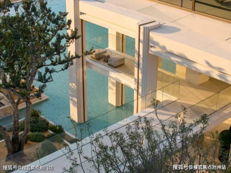 为此他们反复调试了水院底部的瓷砖颜色,以及水的深度,让它与纯色系的石材柱廊、立面,彼此呼应。同时,整个水系也用了和泳池类似的净水系统,不光要在销售阶段保持纯净,今后交付了,同样要打理得纯净透亮。