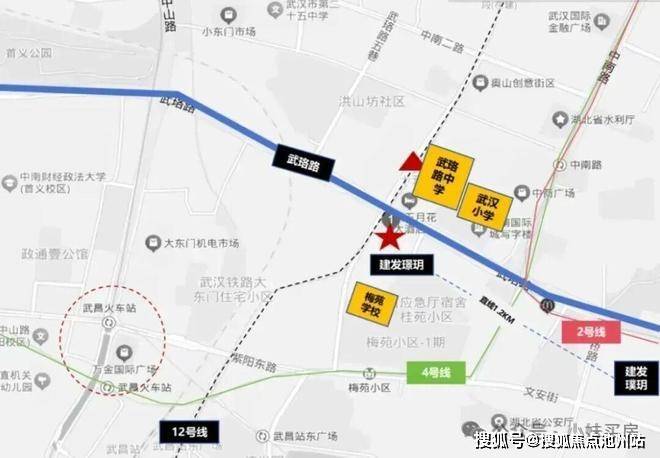 项目具体位置在武珞路与梅苑路交汇处,正处在武昌内环线的边缘。从地图上看,这里是个典型的“T”字型黄金路口,东北侧是帝斯曼国际中心和武汉小学本部,西南侧是梅苑学校,西北边隔着梅苑路是佳兆业广场天御。