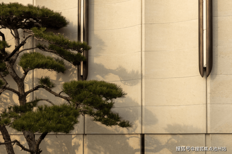 门头两侧,黑松孤植入画。不得不说一下天曜序这棵非常罕见的镇宅黑松,它完全没有其它楼盘常见的那种“矫揉造作的人工痕迹”,而是天然的飘逸、俊秀、兼具苍古之姿,冠幅舒展层次丰富,颇具山水画卷的意境之美: