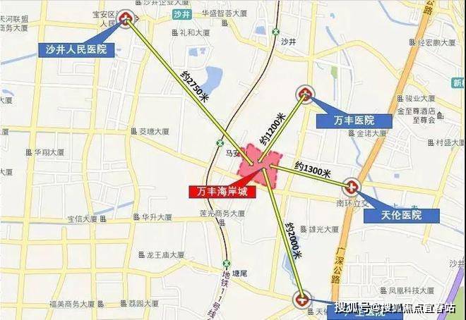 3km内沙井人民医院,项目1公里范围内分布有马鞍山社康,万丰社区社康,除此之外距离项目较近的两所医院是万丰医院和深圳天伦医院,日常小的身体不适可就近就医相对便利。离项目最近的大型公立医院是沙井人民医院,距离项目直线距离约2.75公里,距离稍远,缺少一定便利性,医疗借助交通工具通行。