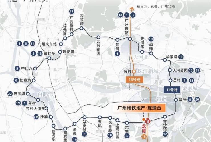珑璟台的位于11和18号线交汇龙潭站,1站磨碟沙、2站冼村,11号线还是广州首条大环线,19个换乘站点,串联天河、海珠、越秀、荔湾四个主城区以及多个CBD。