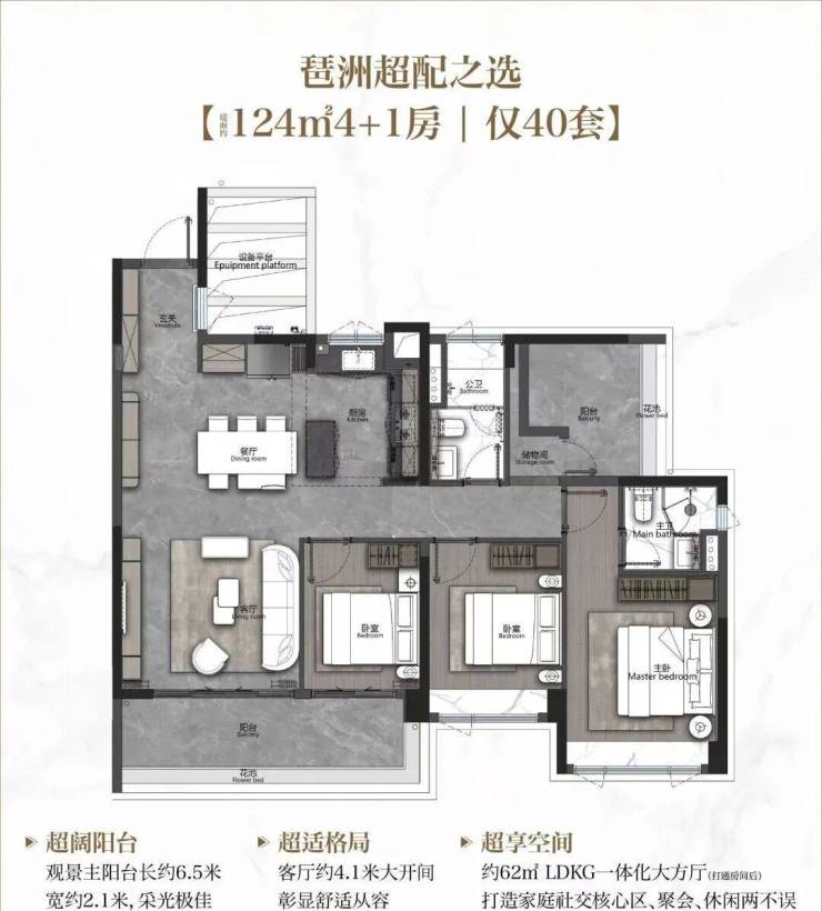 建面124平四房,约6.5米的宽景阳台,客厅开间约4.1米,由于设备平台全赠送做到了大客厅、大阳台之外还能改做4+1房。