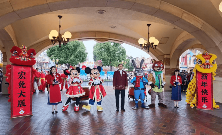 上海迪士尼乐园入口处特别装饰了新年祝福语。红绸、灯笼、鲜花、葫芦等节庆纹样,与迪士尼经典动画中的兔子形象搭配在一起,吸引人们驻足合影。