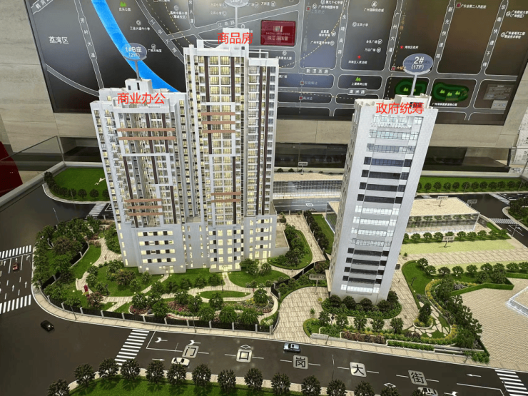 项目共有三栋楼,其中一栋为商业办公楼,一栋为政府统筹用房,一栋为商品楼。