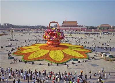 天安门广场“祝福祖国”巨型花果篮和长安街沿线14个花坛已经完工,9月25日正式亮相。