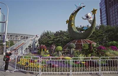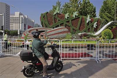在天安门广场,“祝福祖国”花果篮漂亮又大气,吸引游客驻足拍照。在长安街上,造型各异的花坛色彩鲜艳,一些新品种引起了大家的注意。