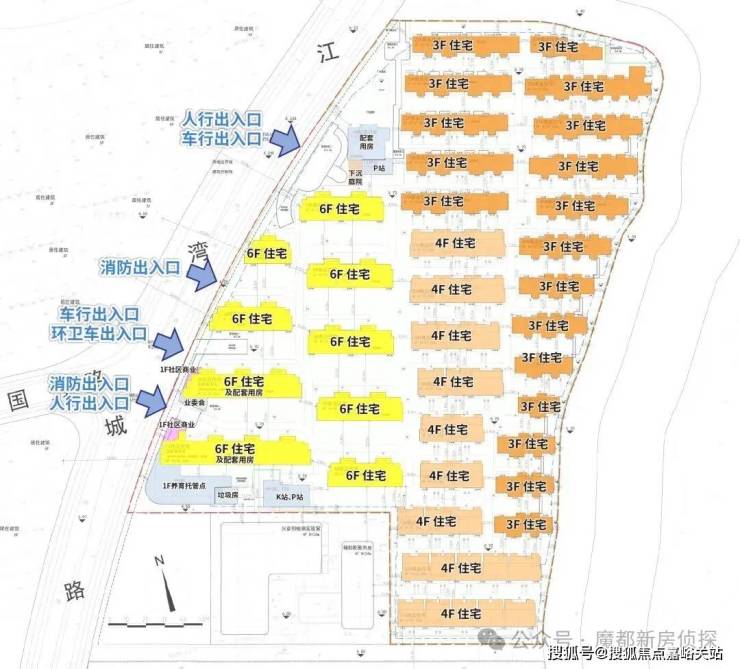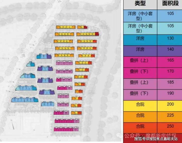 (2)沿河布局: 一线临河道+绿化的楼栋总共17幢。采取了东高西低的策略,其中东侧和北侧7字型排布3F联排别墅,其后依次布局4F叠墅与6F洋房,使前排建筑不遮挡后排视野,超过半数楼栋可享受水系与公园景致。