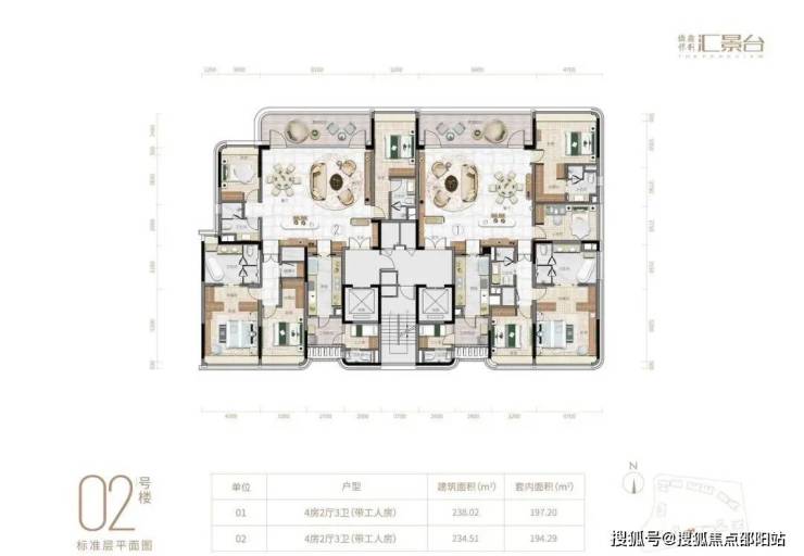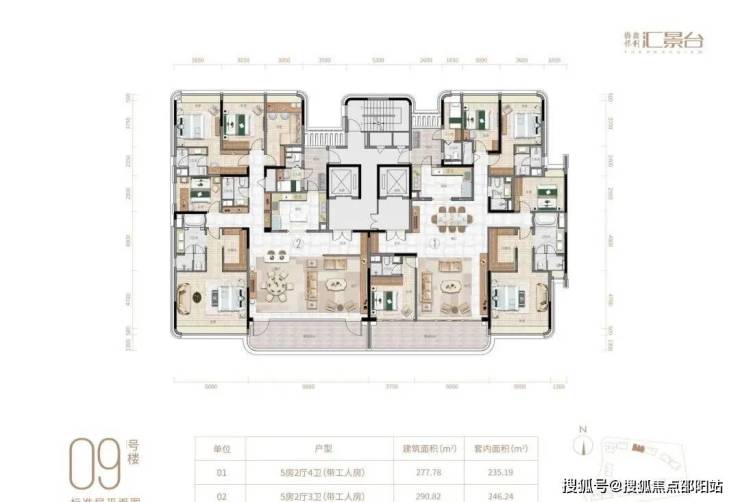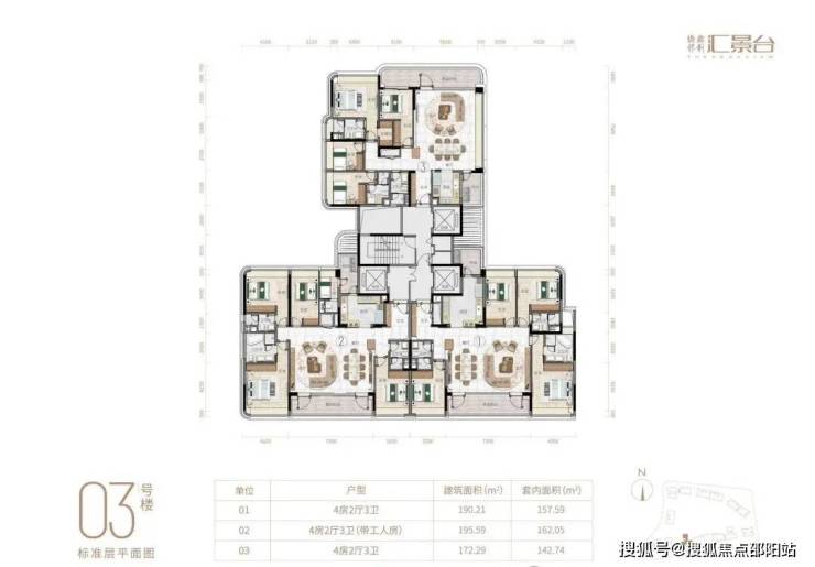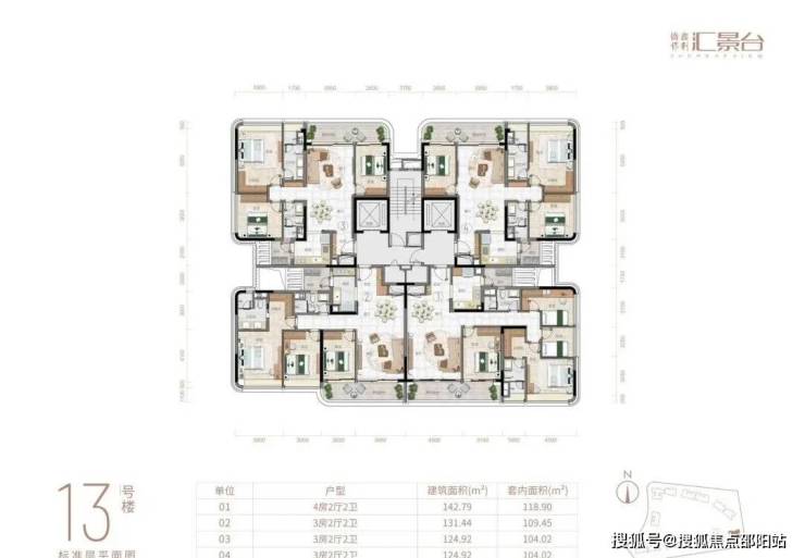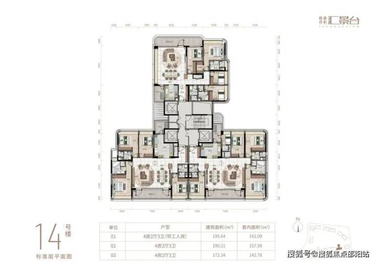 项目由14栋12层小高层组成,产品涵盖123-352㎡三至五房,共8类户型,户型实用率约82-84%