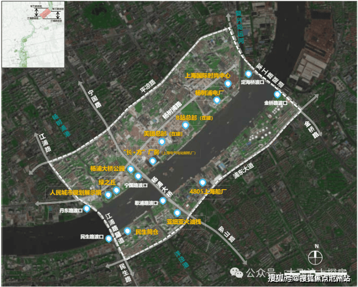 在杨浦滨江版九宫格中,主要是高端住宅+1块风貌商办,而紧邻九宫格的四至方位可以看到:
