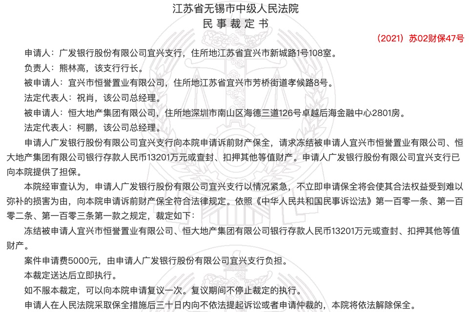 近日,江苏省无锡市中级人民法院的一则民事裁定书显示,广发银行宜兴支行向法院申请诉前财产保全,请求冻结宜兴市恒誉置业有限公司、恒大地产集团有限公司银行存款人民币13201万元或查封、扣押其他等值财产。本裁定送达后立即执行。申请人广发银行宜兴支行已向法院提供了担保。