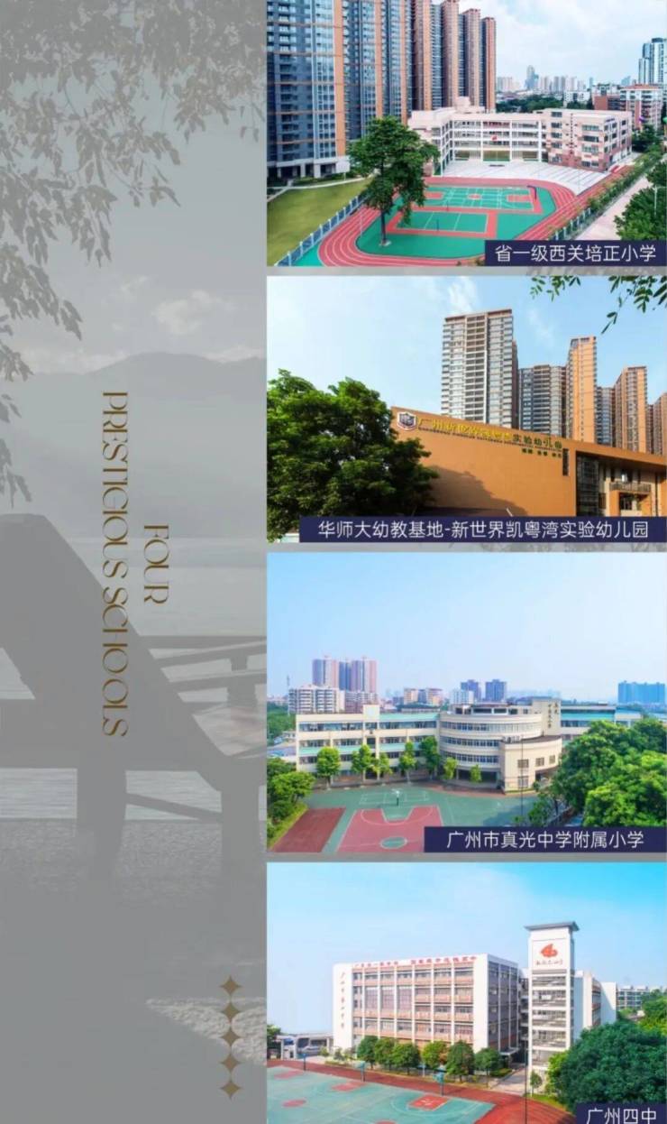 项目旁边就是新世界凯粤湾实验幼儿园,省一级西关培正小学,仅招收凯粤湾小区业主子女,省一级的广州四中新世界校区也在旁边,还有华师和培正。