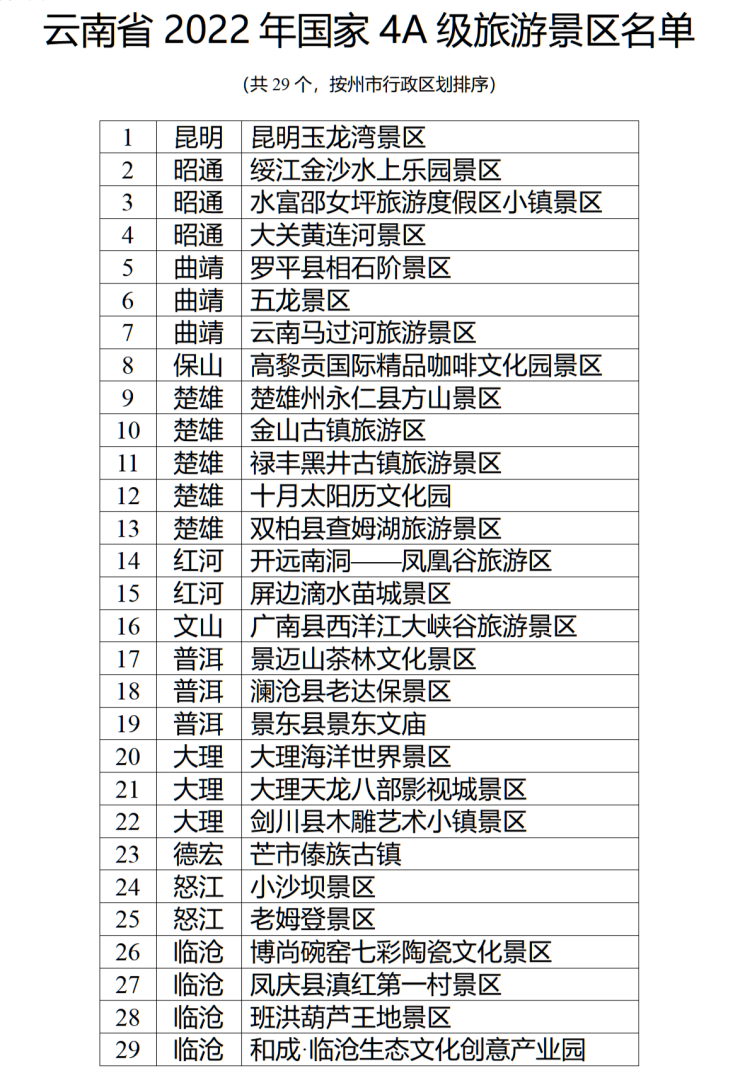 云南省2022年确定29家国家4A级旅游景区