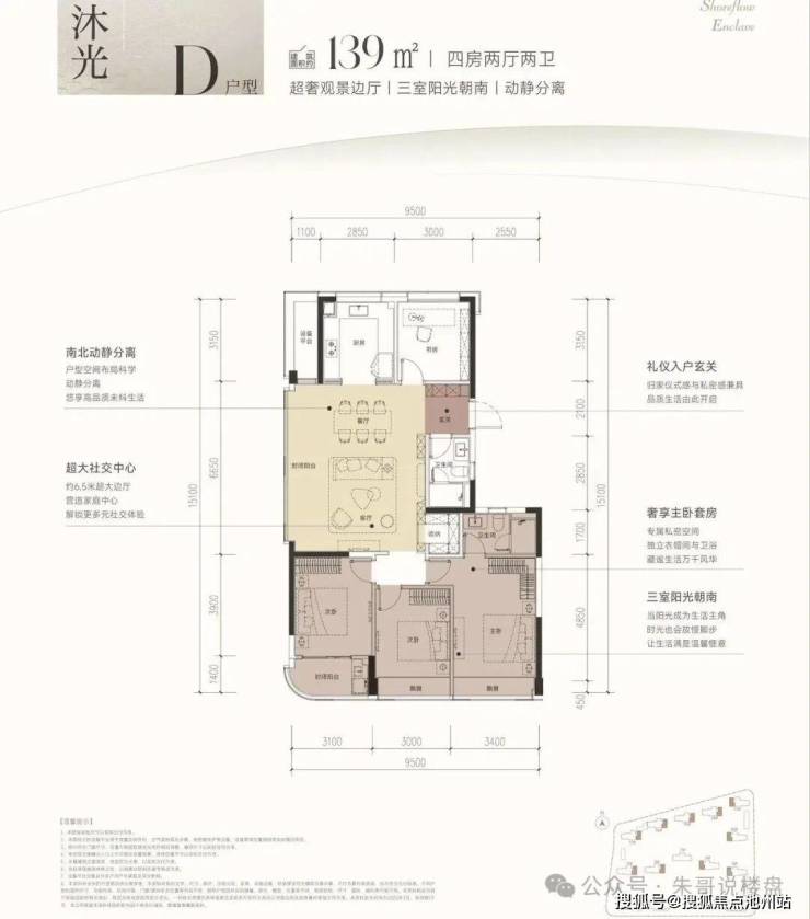 139㎡户型:双套房设计(主卧+次卧),次卧带独立卫浴,厨房配备双开门冰箱位