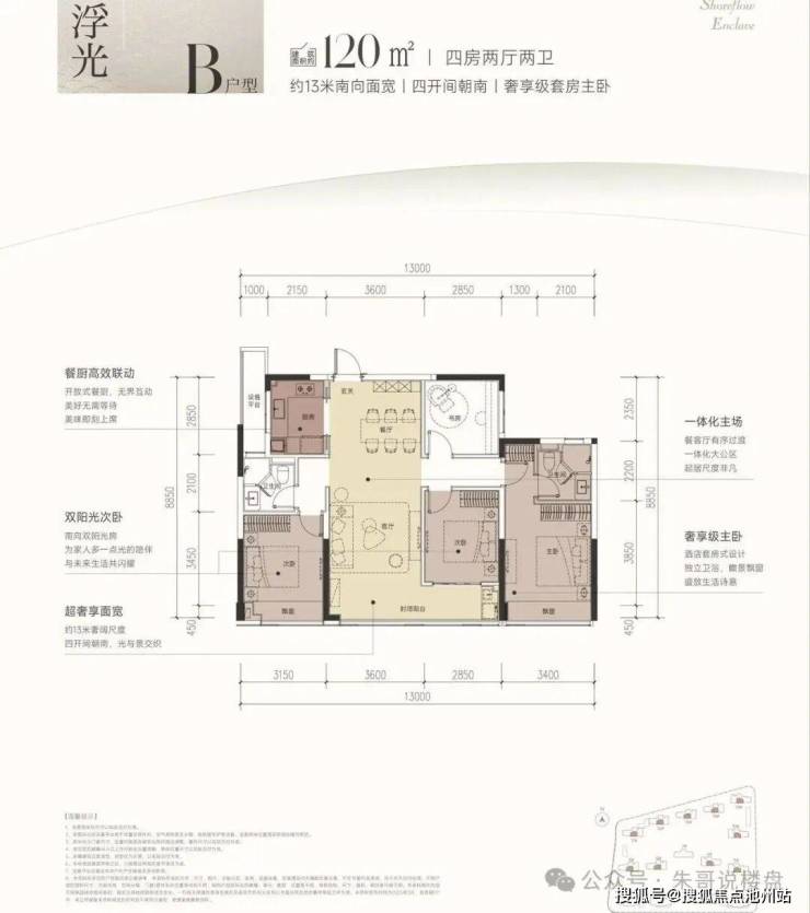 120㎡户型:四开间朝南,总面宽约13米,三个卧室和餐客厅均朝南,双联大阳台+双飘窗