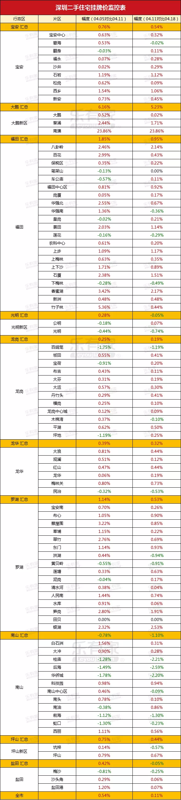 据乐有家门店数据监控显示,截止4月18日,深圳全市二手住宅挂牌价环比继续保持稳定,大部分片区二手住宅挂牌价呈现上浮趋势,但基本处于合理的涨跌幅度。