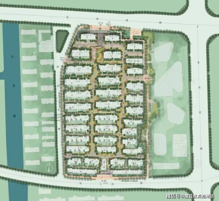 小区主出入口设计在了小区北侧的宝带西路上,次出入口则设置在南侧的长兴路上。小区西侧为规划支路,东侧规划为商业商务项目。