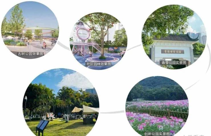 星河臻华府倚山而建,配建公园式社区 园林;毗邻古树公园,现代城市界面与古树保护园区相融合;更享周边三大公园环绕,悦享都市森林氧吧。