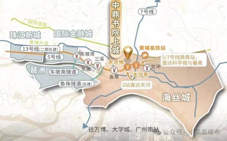项目二期距离5号线地铁大沙地站约980米,步行大概需要14分钟,加推的三期去地铁口会近100多米,乘坐5号线无需换乘可直达金融城和珠江新城,也可1个站到大沙东站换乘7号线{项目步行至大沙东约1.5公里},自驾的话,周边有广园快速、黄埔大道、广佛高速等干线,去天河都非常方便。