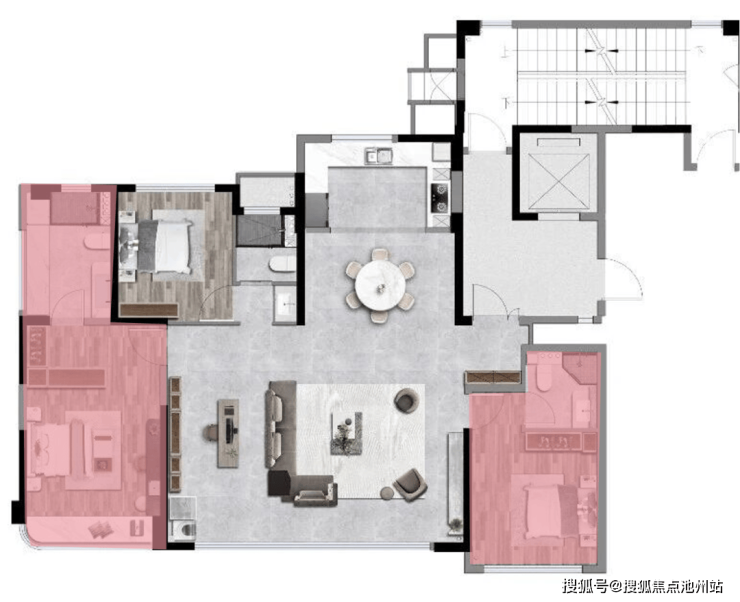 也可以是“三代美满户型”,小心机便是两间南向全套房设计,分别给夫妻、长辈住,最大化切割入室动线,避免因生活作息不同的代际矛盾。同时,根据家庭人数,约8米的宽厅也具备再隔断出一间南向次卧的尺度。