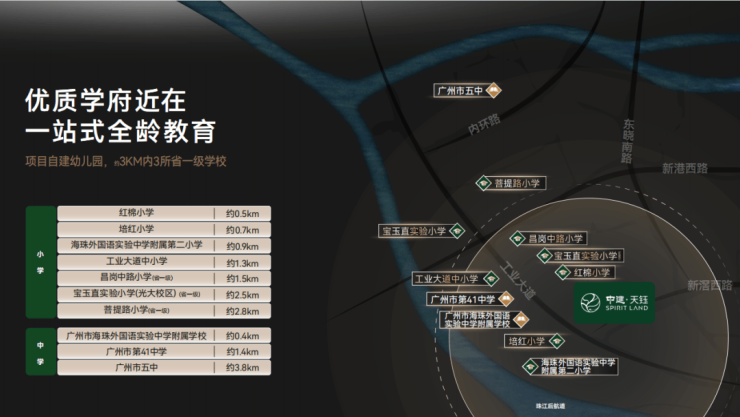 项目自带一所幼儿园,小学以上就要依赖周边,距离最近的公办小学是海珠区金碧第一小学(西校区)和海珠区石溪劬劳小学,两所小学对口初中分别在第五组和第七组。