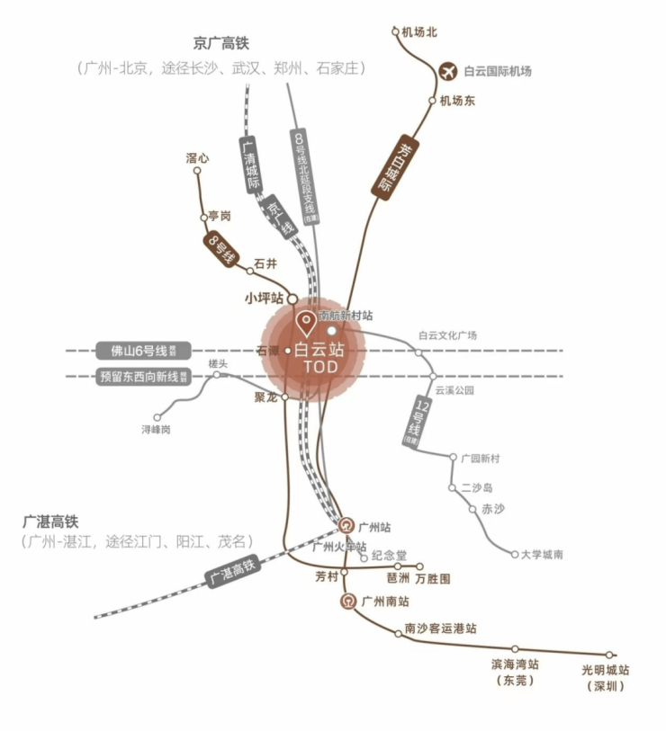 白云站已接入地铁8号线,未来还将新增5条地铁线路,并与芳白城际(连接白云机场)形成空铁联运。立体化的交通体系,让【白云站TOD粤胜广场】成为“流量枢纽”,辐射湾区乃至全国的高频商务与旅游人群。