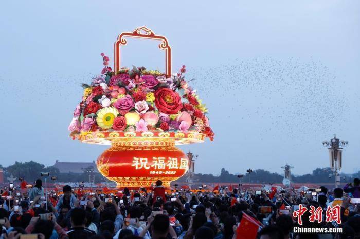 图为市民游客拍摄天安门广场中的国庆主题花坛。 中新社记者 韩海丹 摄