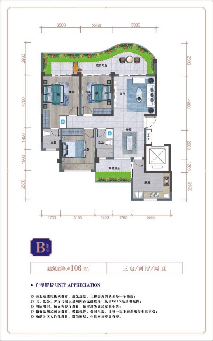 B户型 三房两厅两卫双阳台