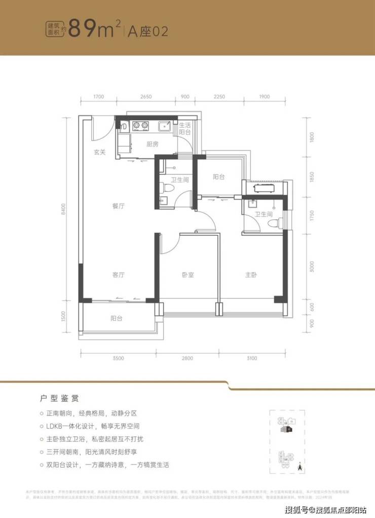 建面约89㎡正南户型(可售54套),三开间正南朝向,LDKB一体化设计,动静分区。