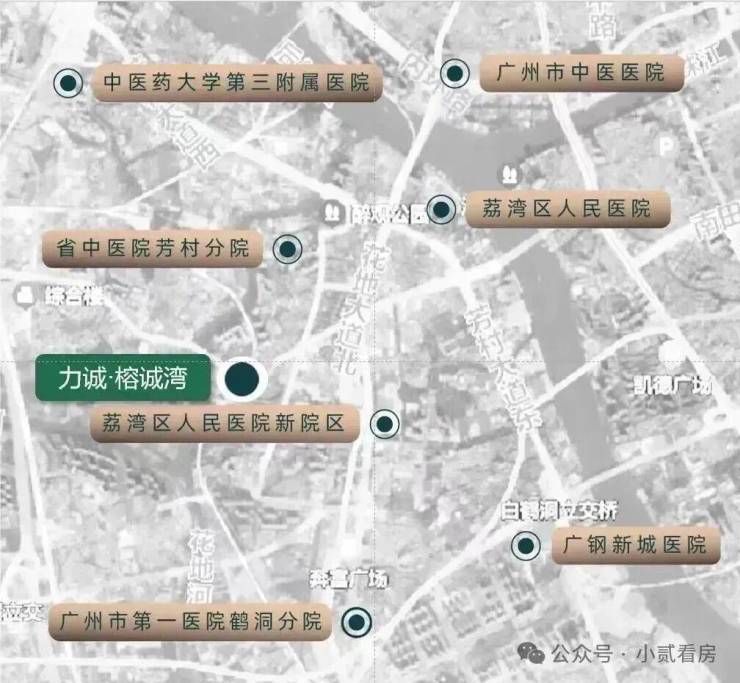 广州市第一医院鹤洞分院、广州市中医医院和惠爱医院。前沿综合医院环绕,全面照护:省中医院芳村分院、中医药大学第三附属医院、荔湾区人民医院、荔湾区人民医院新院区(已运营)和广钢新城医院等。