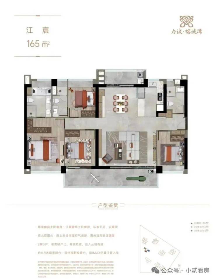 建面约165㎡,打造南北双阳台,南向四开间望江,观景阳台的长度能够达到8.8米,在观景体验上,是几个户型中最好的。