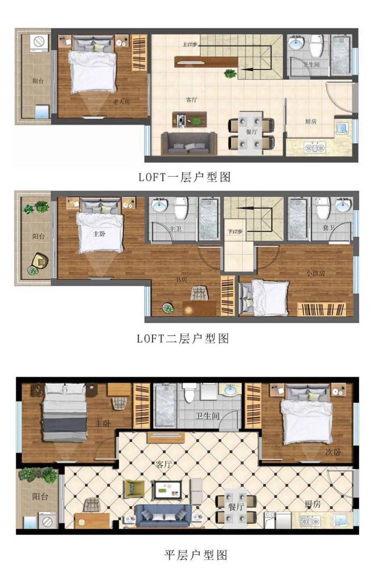 户型面积:建筑面积约56.6㎡-57.45㎡三室两厅三卫多功能舒适loft(实际面积约为113.2-114.9 ㎡)、建筑面积约 89.24㎡两室两厅一卫平层