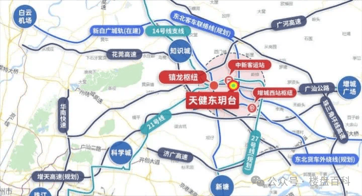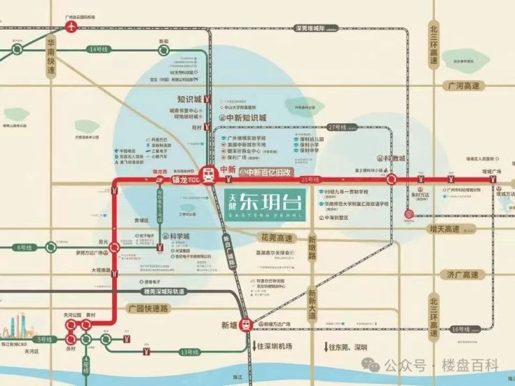 地铁——直线距离广州地铁21号线中新地铁站800米左右,1站到镇龙站(14号线),2站科学城,3站到天河;21号线直达员村、14号线串联知识城、27号线直达新塘交通枢纽(规划);城轨有新白广城轨(镇龙站到广州白云机场、深圳机场);莞深-新白广城际穿梭大湾区核心城市(北至广州北站、白云机场,南达东莞虎门火车站、深圳宝安机场,西连佛山西站、广州东站等);