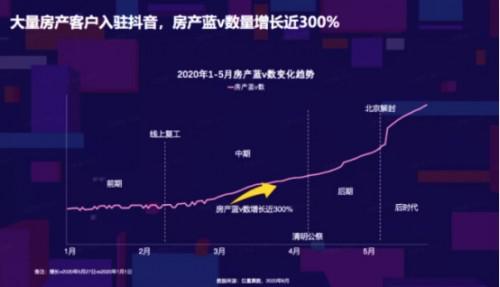根据巨量算数统计,2020年1-5月,入驻抖音的房企蓝V账号增加了300%,抖音上开发商开播数增长了近700%。截至2020年9月,巨量引擎房产活跃用户超过4500万,相较1月份增加近30%。