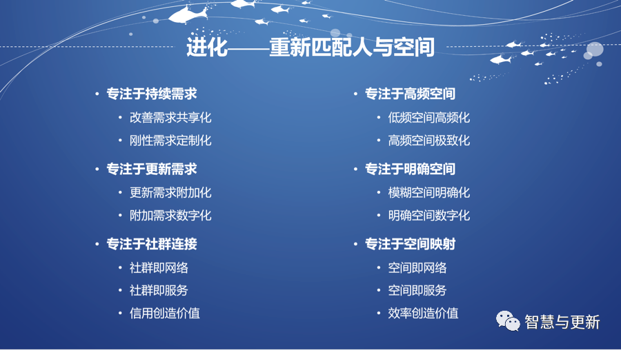 最后实实在在看业务上,我们要进化,进化成新物种——群智能阿米巴——重新匹配人和空间,这是我们使命。