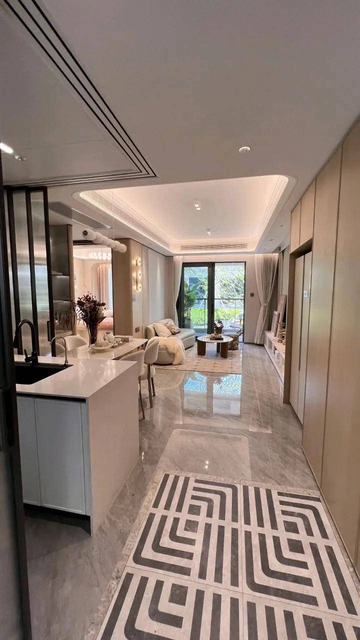 入户大堂,更会感受到一种别样的尊贵体验。顶部仿石材艺术玻璃以其独特的纹理和质感,犒赏着每一位归家的业主。蓝金沙岩板则平添了一份奢华与神秘的美感,让人仿佛置身于一个充满魔力的空间中。而大面积的镜湖春晓岩板,以其淡雅内敛的光泽,带来了一种非同一般的尊贵感。