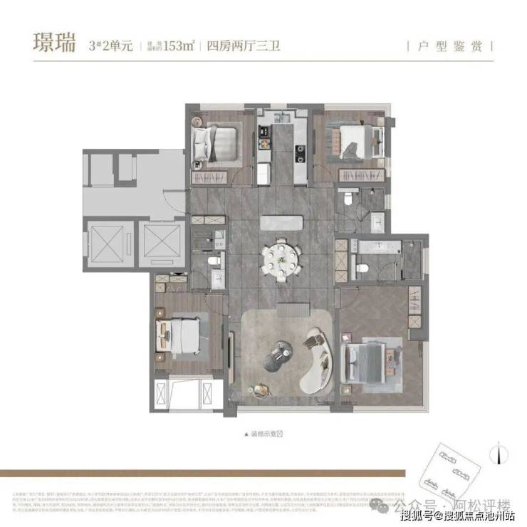 建面约153平,四房三卫:3号楼东边户,“四叶草”结构布局,同时两个卧室能做到270° 景观视野。